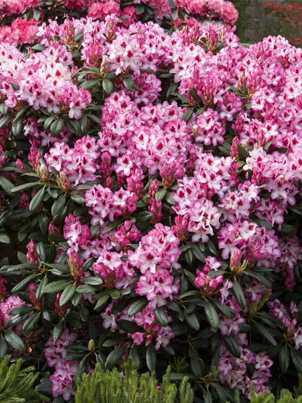 Der Rhododendron-Hybride 'Hachmann's Charmant'(s) setzt schöne Akzente gemeinsam mit: