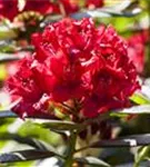 Rhododendron 'Karl Naue' bildet von Mai bis Juni zahlreiche trichterförmige, in Dolden angeordnete, purpurrote Blüten.