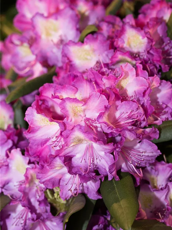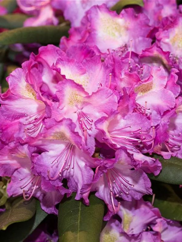 Rhododendron yakushimanum 'Bohlken´s Lupinenberg'® bildet von Mitte Mai bis Ende Mai zahlreiche trichterförmige, lilafarbene Blüten.