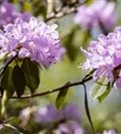 Der Rhododendron 'Lilly Bell® Pearl' ist immergrün und trägt grau-grüne lanzettliche Blätter.