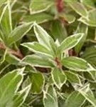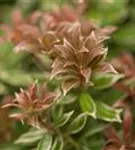 Hoher Blattschmuckwert. Die immergrünen Blätter des Schattenglöckchens 'Little Heath' sind dunkelgrün, lanzettlich, glänzend, quirlständig, ganzrandig und weisen einen weißen Rand auf. Diese sind etwa 6 - 8 cm groß. Rosa-roter, früher Austrieb.