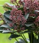 Die dunkelroten Blüten der Skimmie 'Rubesta' erscheinen in Rispen im Mai. Diese sind stark duftend.