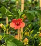 Die roten, trichterförmigen Blüten erscheinen von Juli bis Oktober. Diese werden etwa 5 - 7 cm groß und sind angenehm duftend.