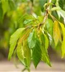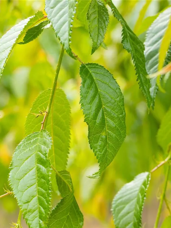 Besonders dekorativ sind die, ovalen, runden Steinfrüchte von Prunus serrulata 'Kiku-shidare-zakura'.
