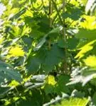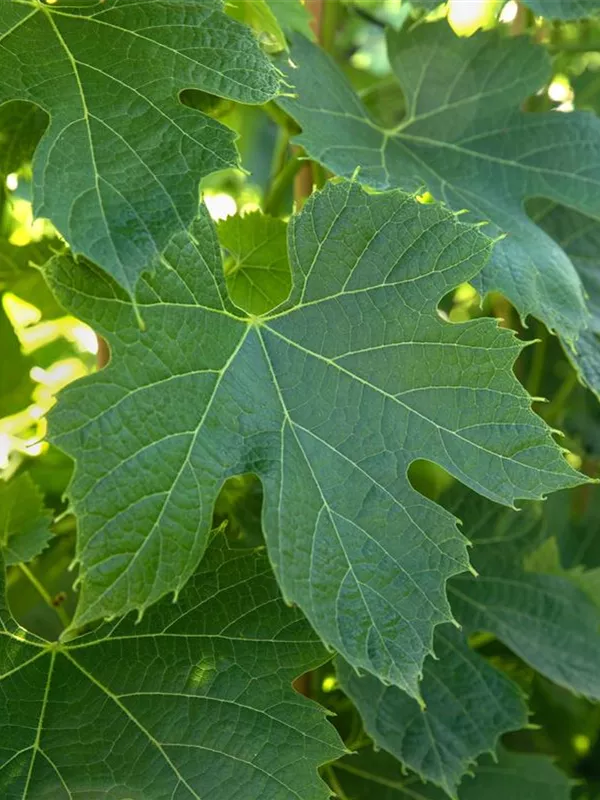 Die sommergrünen Blätter der Weintraube 'Phoenix' sind dunkelgrün, herzförmig, gezähnt. Weintraube 'Phoenix' zeigt sich leuchtend kupfergelb bis rot im Herbst.