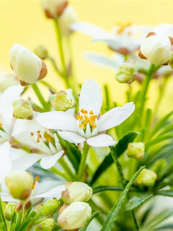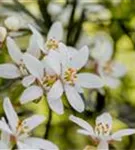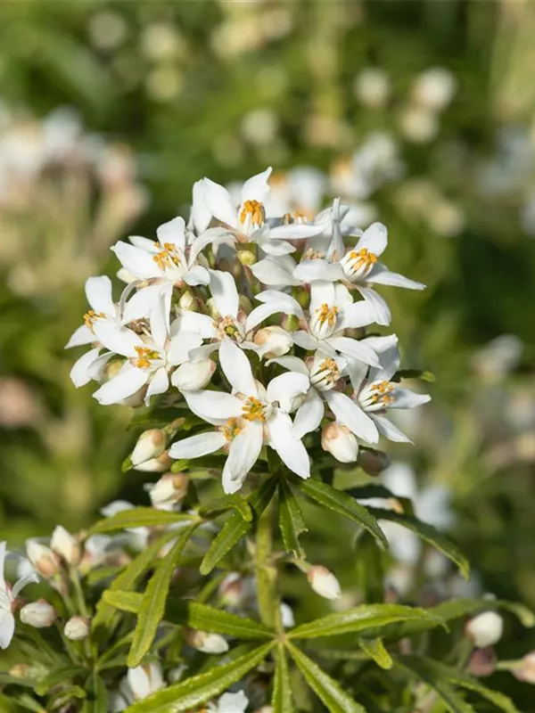 Choisya ternata 'White Dazzler' bildet während der gesamten Saison zahlreiche sternförmige, weiße Blüten. Diese verströmen einen starken Duft.