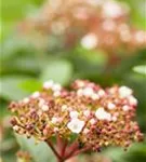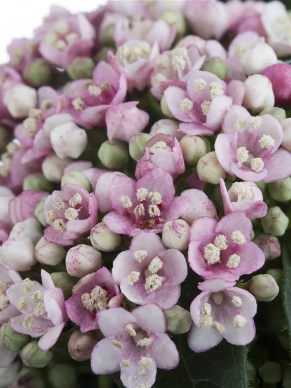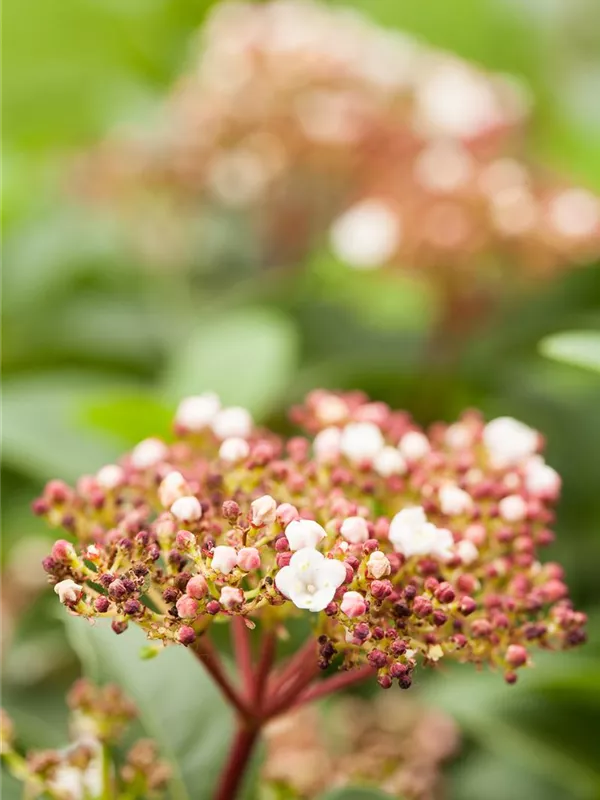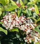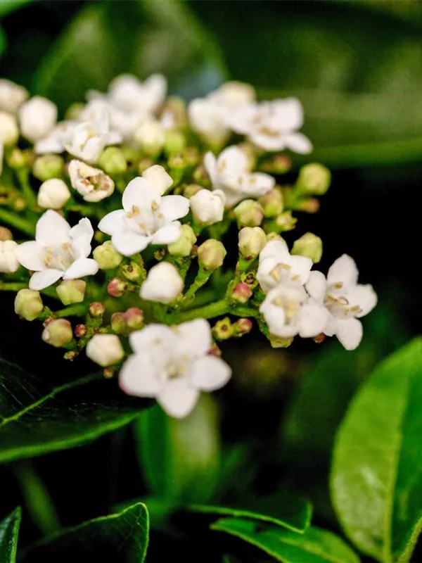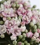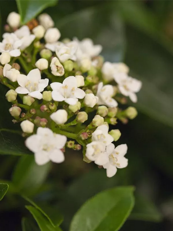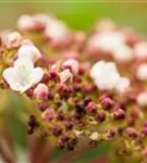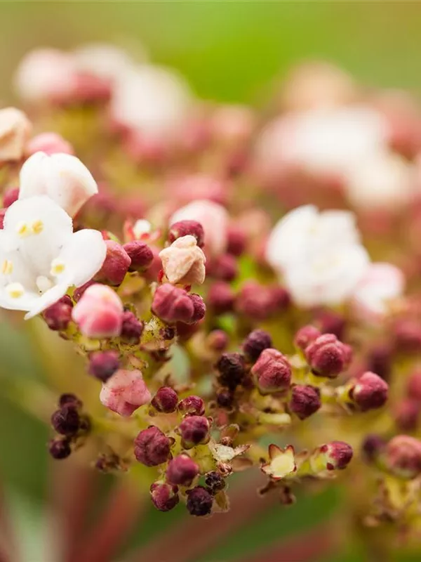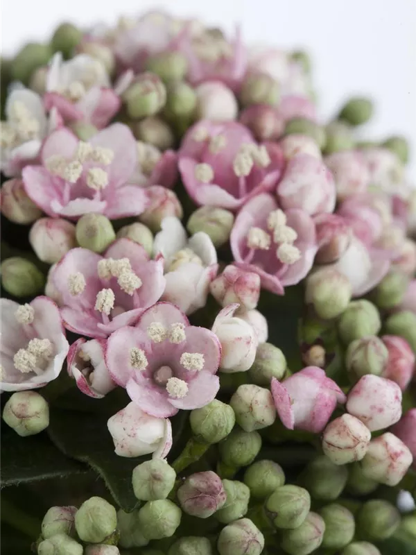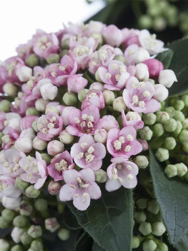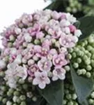 Die hellrosafarbenen Blüten des Lorbeer-Schneeball erscheinen in Schirmtrauben von März bis April. Diese sind leicht duftend. Bei richtiger Pflege Nachblüte im November.