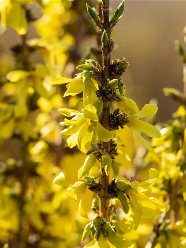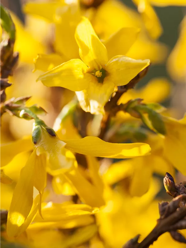 Die gelben Blüten der Forsythie 'Mikador'® erscheinen in Rispen von März bis Mai.