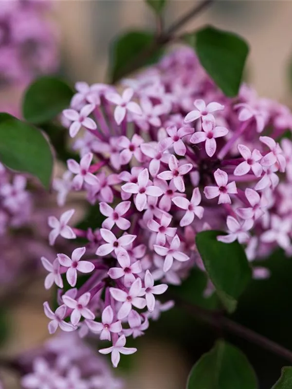 Die lilafarbenen Blüten des Meyer's Flieder 'Josée' erscheinen in Rispen von Mai bis Juni. Diese sind stark duftend.