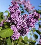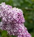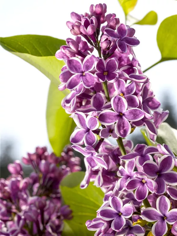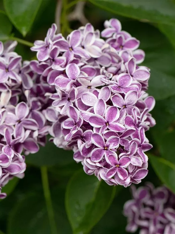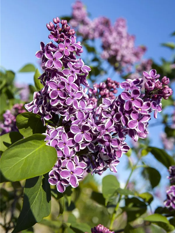 Die violett-weißen Blüten des Edelflieder 'Sensation' erscheinen in Rispen von Anfang Mai bis Ende Mai. Diese sind angenehm duftend.