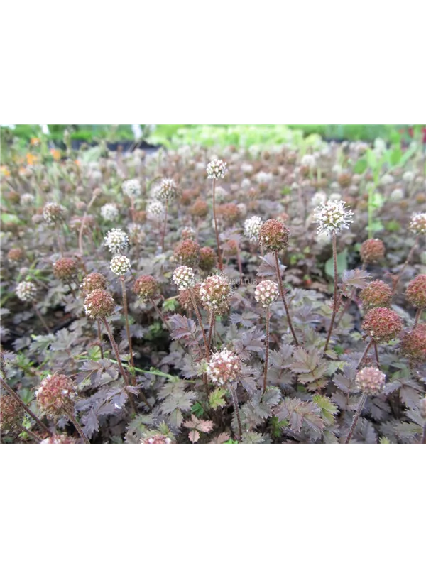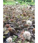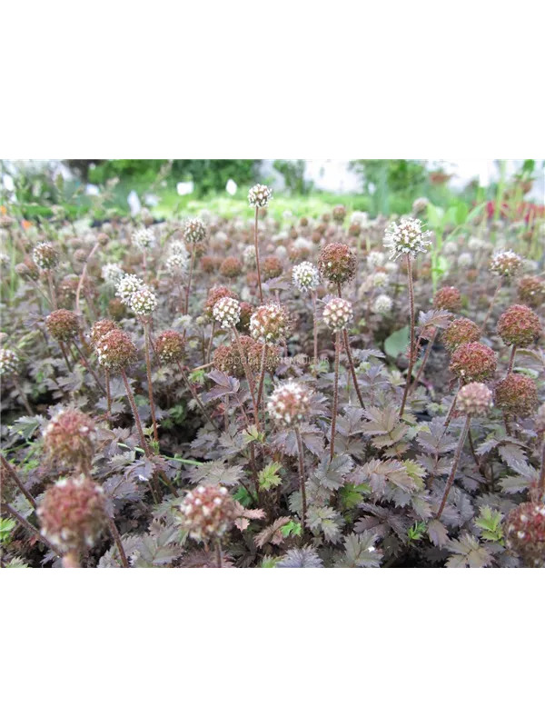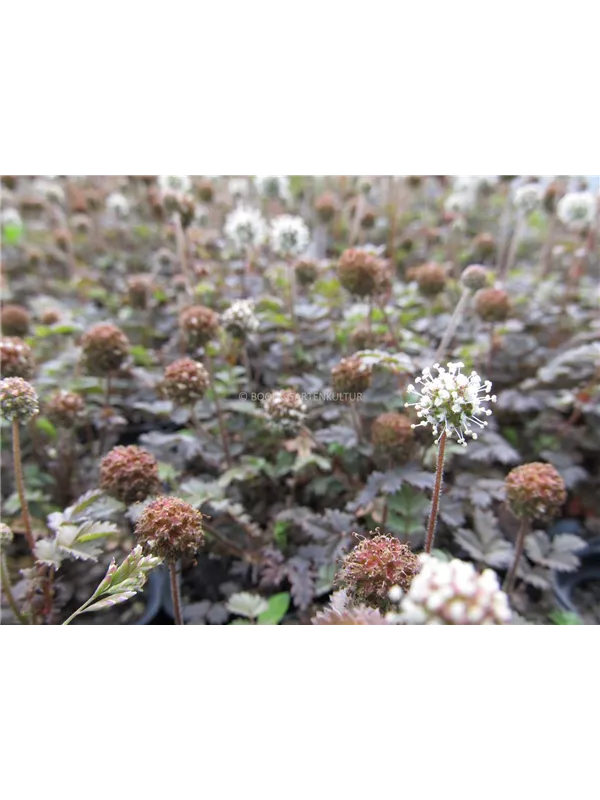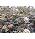 Acaena microphylla 'Kupferteppich' bildet ballförmige, weiße Blüten ab Juni.