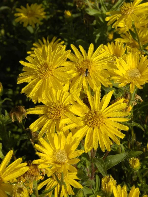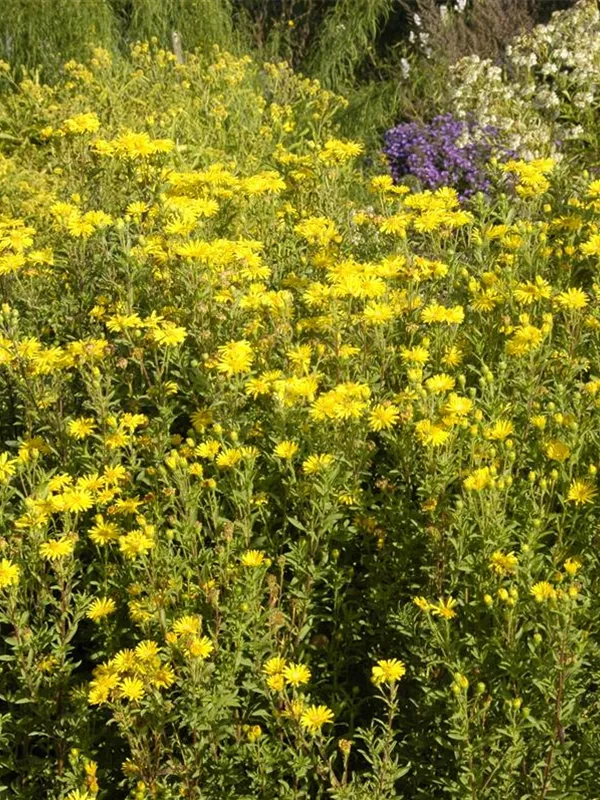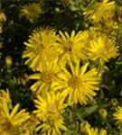 Chrysopsis villosa 'Golden Sunnyshine' bildet strahlenförmige, in Dolden angeordnete, goldgelbe Blüten ab August.