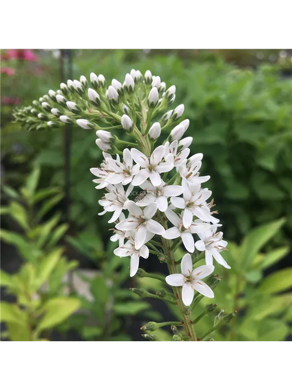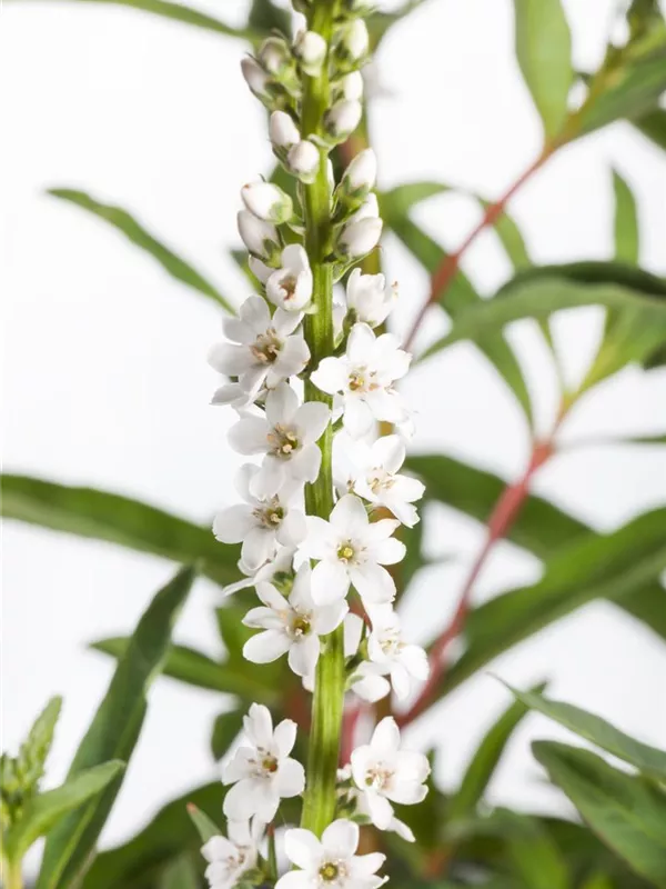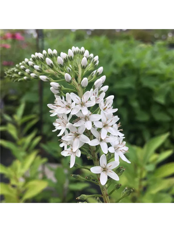 Lysimachia clethroides bildet in Ähren angeordnete, weiße Blüten ab Juli.
