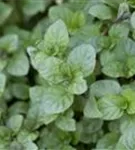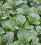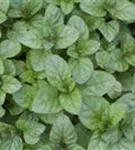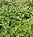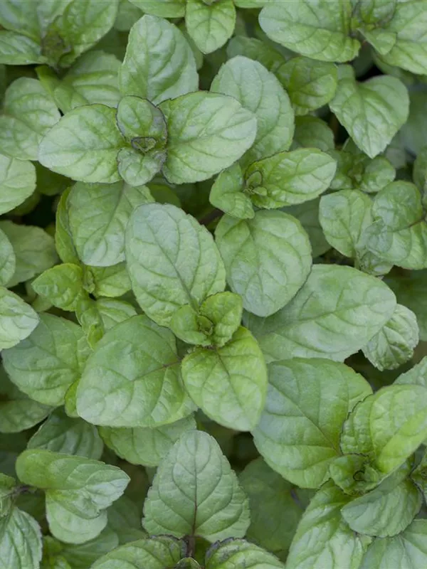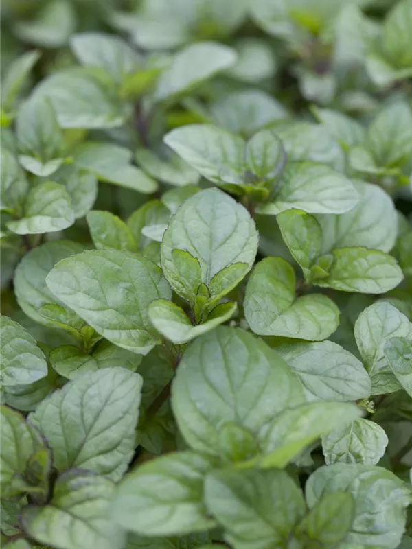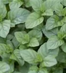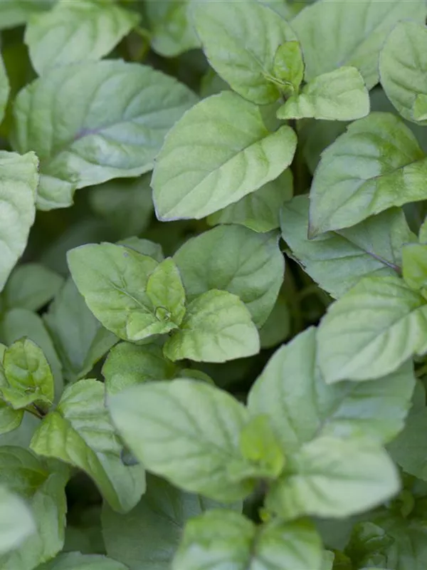 Zum Verzehr geeignet. Die grün-roten, gezähnten Blätter sind eiförmig und überzeugen mit erfrischendem Geschmack.
