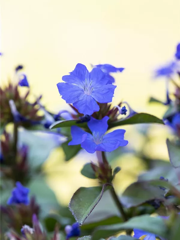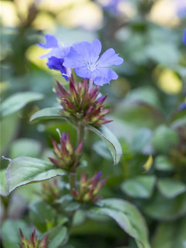 Ceratostigma plumbaginoides bildet radförmige, blaue Blüten ab August.