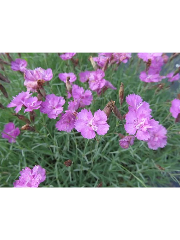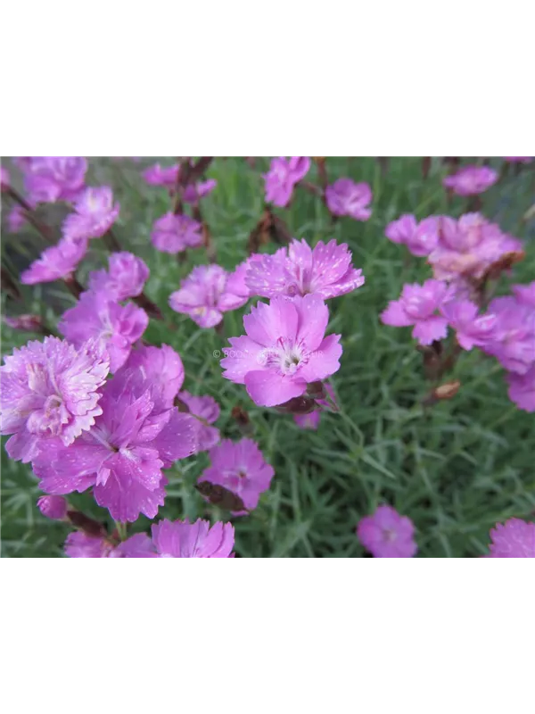 Die wintergrünen Blätter der Garten-Pfingst-Nelke 'Eydangeri' sind grau-grün, lanzettlich.