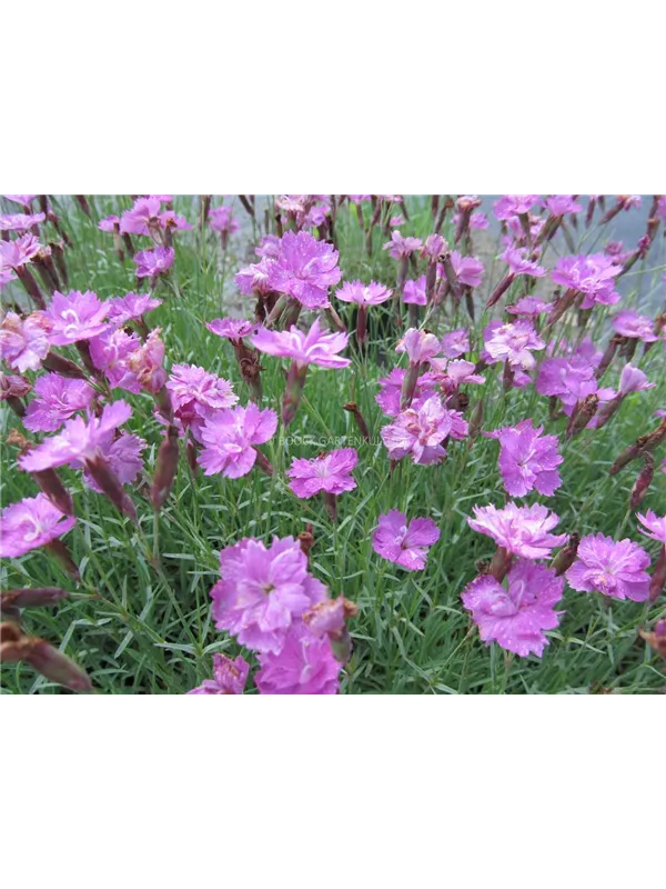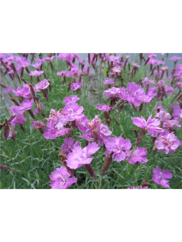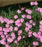 Dianthus gratianopolitanus 'Eydangeri' bildet radförmige, rosafarbene Blüten ab Mai. Diese verströmen einen angenehmen Duft.