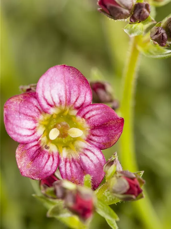 Saxifraga x arendsii 'Harder Zwerg' bildet schalenförmige, dunkelrote Blüten ab April.