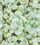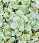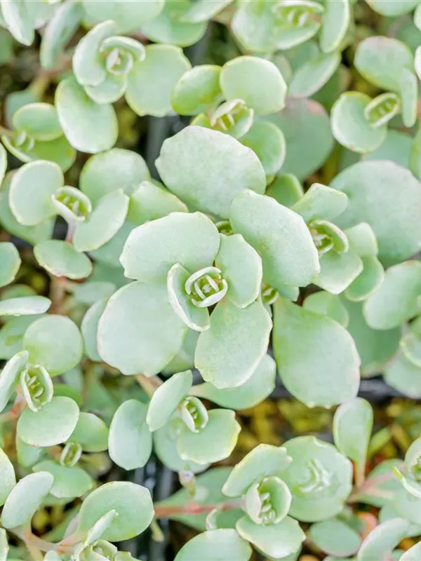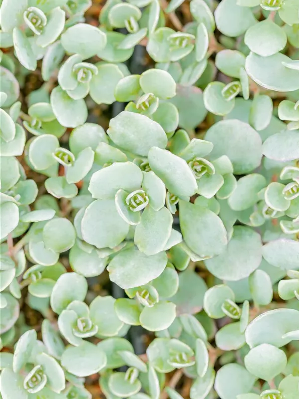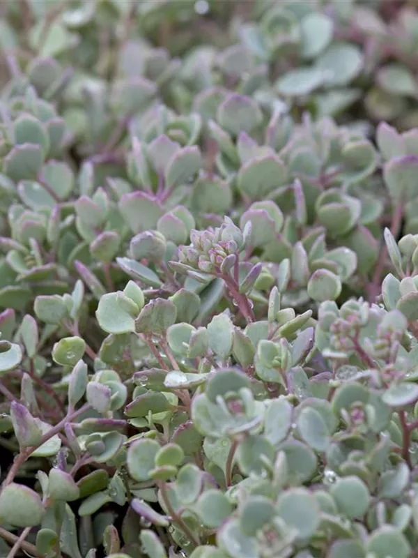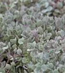 Die sommergrünen Blätter des Garten-Fettblatts 'Lidakense' sind grau-grün, dickfleischig, rundlich.