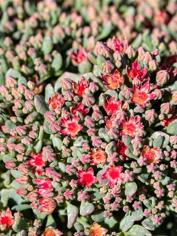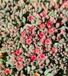 Sedum cauticola 'Lidakense' bildet sternförmige, in Dolden angeordnete, karminrote Blüten ab August.