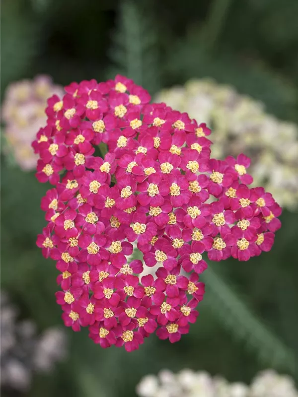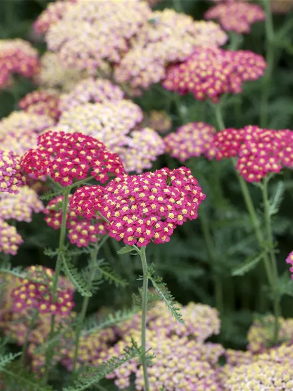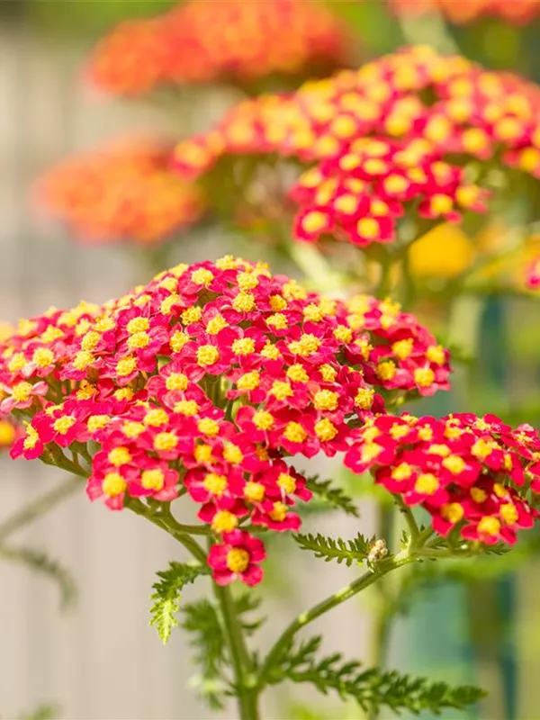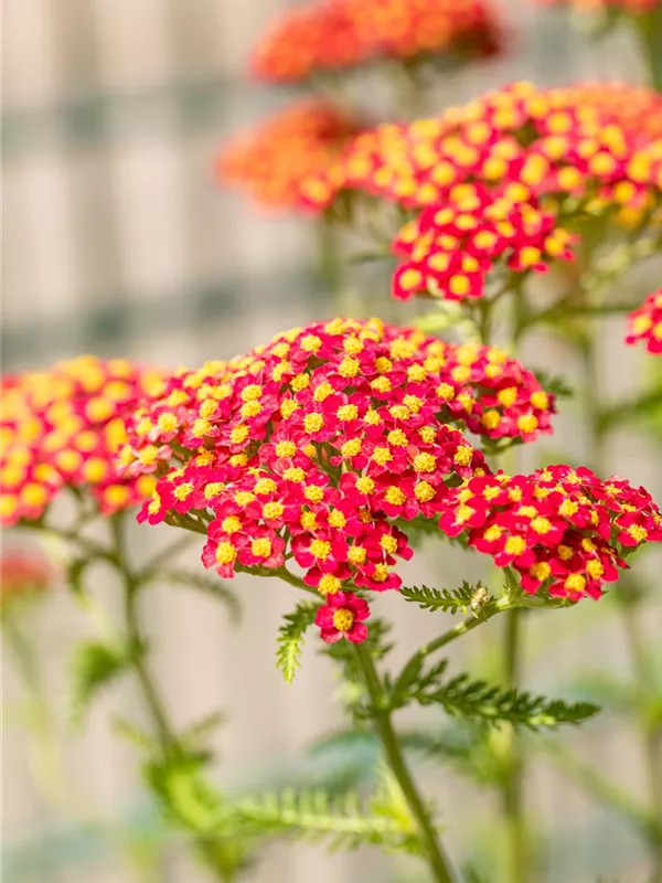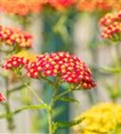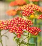 Achillea millefolium 'Paprika' bildet in Dolden angeordnete, rote Blüten ab Juni. Diese verströmen einen angenehmen Duft. Bei richtiger Pflege Nachblüte im September.