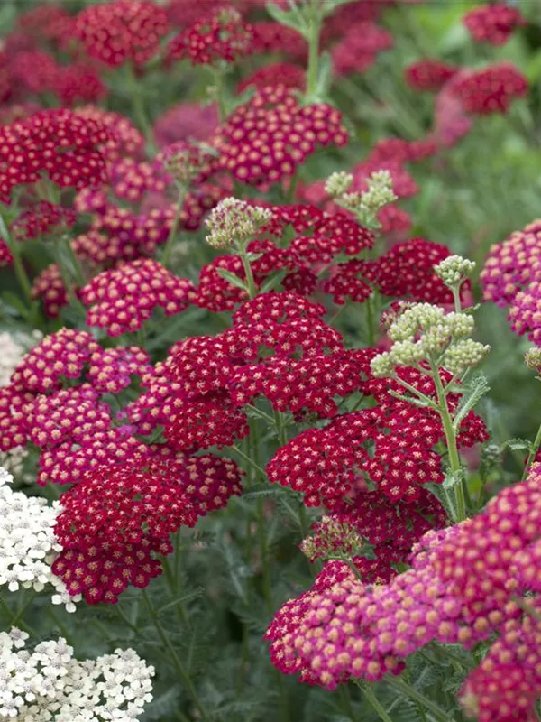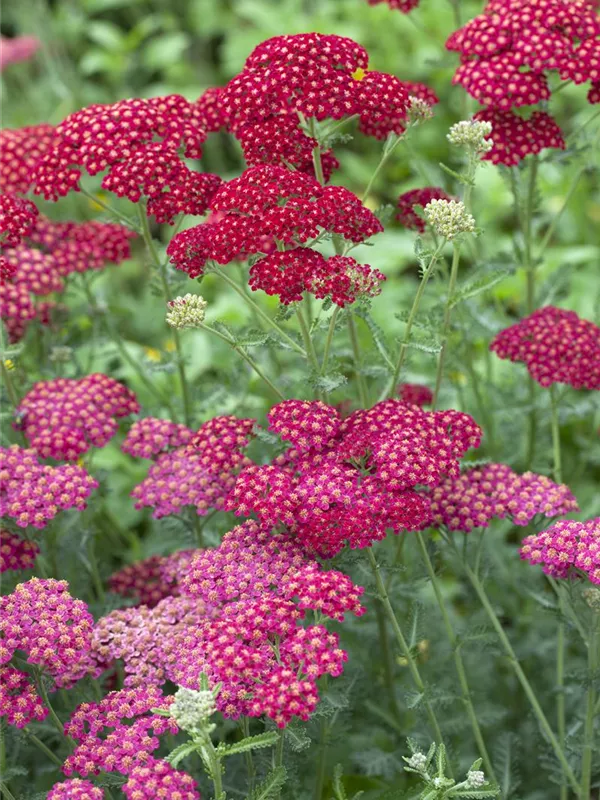 Achillea millefolium 'Red Velvet' bildet in Dolden angeordnete, rote Blüten ab Juni. Diese verströmen einen angenehmen Duft. Bei richtiger Pflege Nachblüte im September.