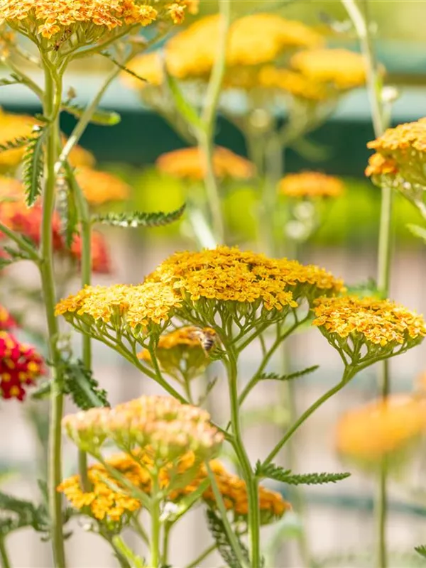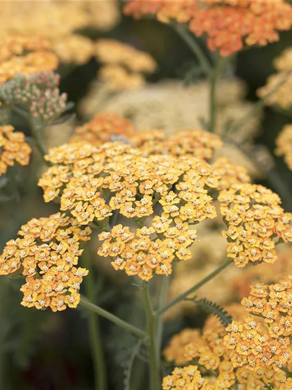 Achillea millefolium 'Terracotta' bildet in Dolden angeordnete, orange-rote Blüten ab Juni.