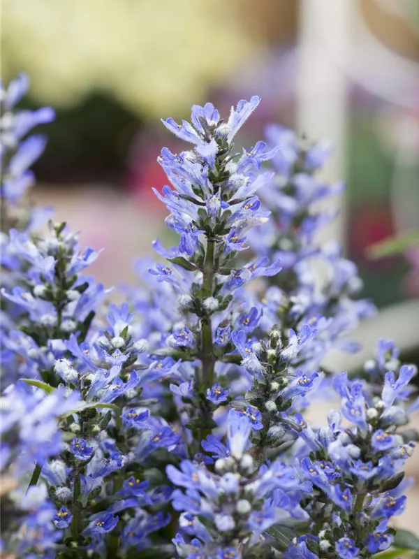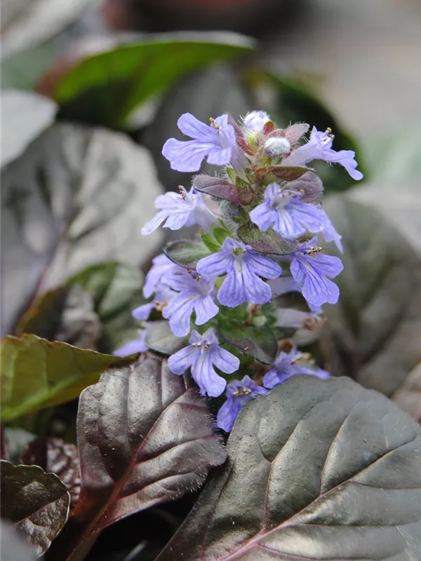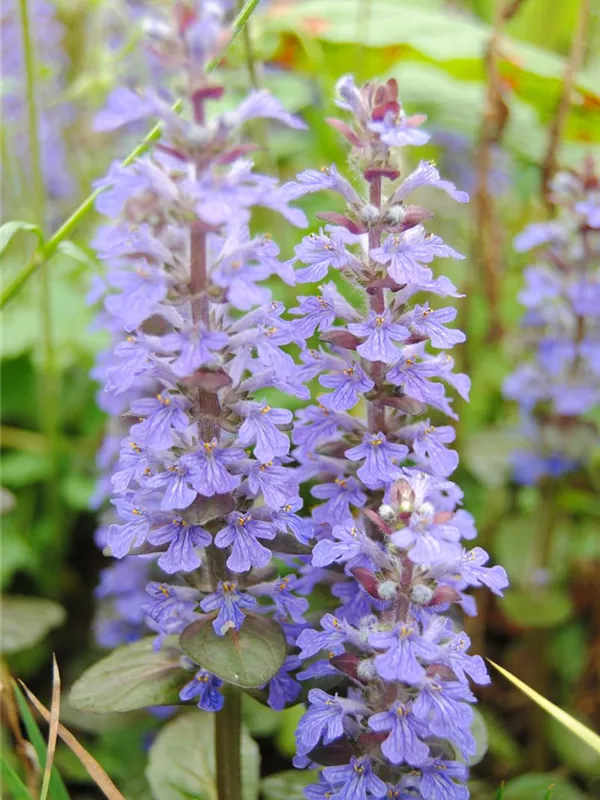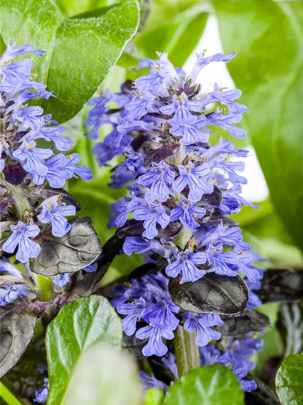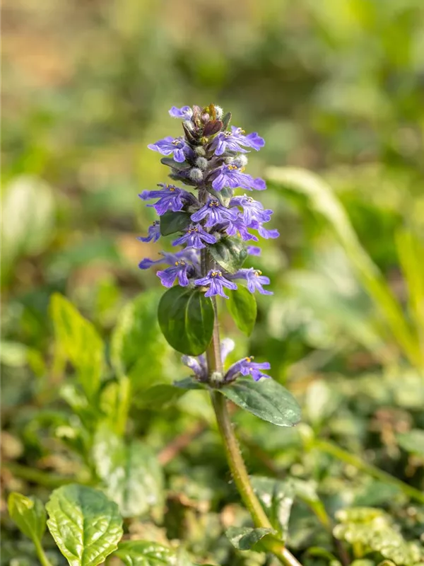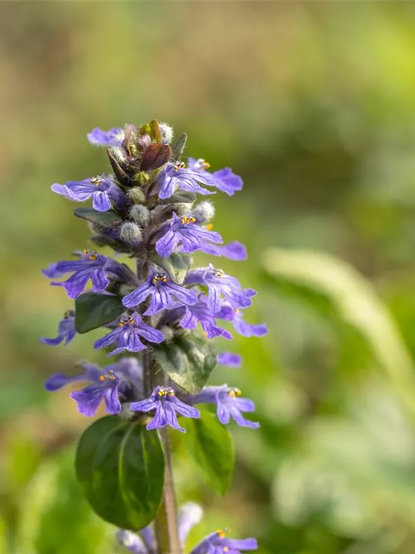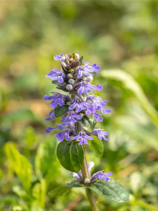 Ajuga reptans bildet lippenförmige, in Quirle angeordnete, blaue Blüten ab April.