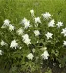 Aquilegia caerulea 'Kristall' bildet glockenförmige, weiße Blüten ab Mai. Diese werden etwa 7 - 8 cm groß.