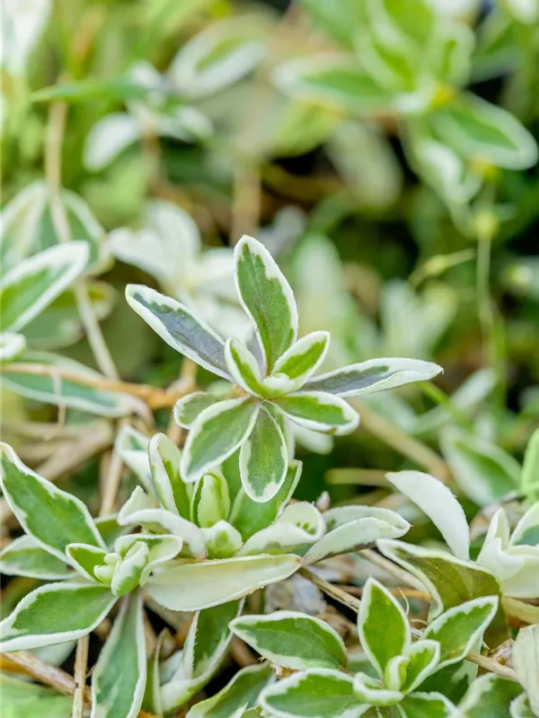 Hoher Blattschmuckwert. Die wintergrünen Blätter der Kleine Garten-Gänsekresse 'Variegata' sind grün, lanzettlich und weisen einen weißen Rand auf.