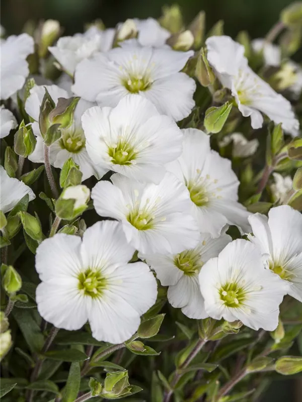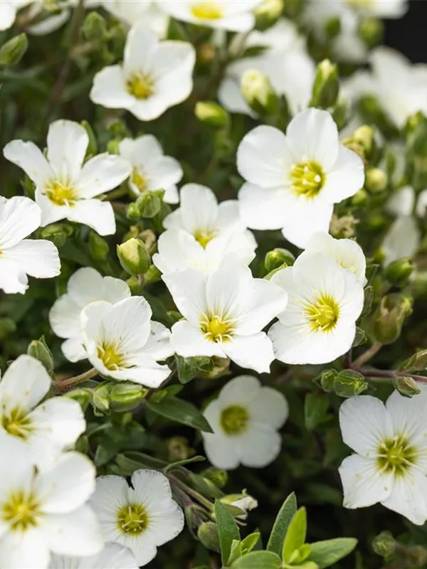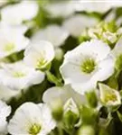 Arenaria montana 'Blizzard Compact' bildet schalenförmige, weiße Blüten ab Mai.