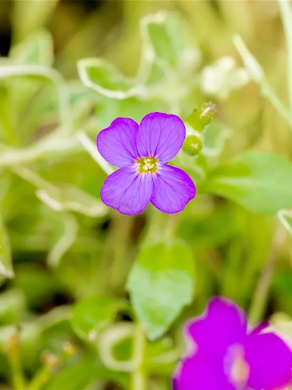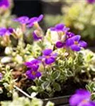 Aubrieta x cultorum 'Silberrand' bildet radförmige, blauviolette Blüten ab April.