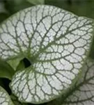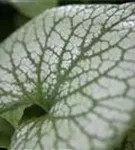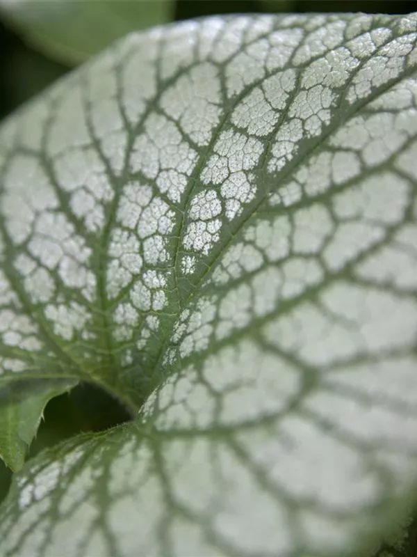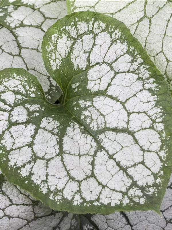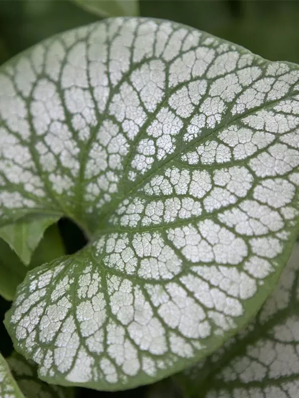 Hoher Blattschmuckwert. Die sommergrünen Blätter des Kaukasusvergissmeinnichts 'Jack Frost'(s) sind silberweiß, grün geädert, herzförmig und weisen einen grünen Rand auf.