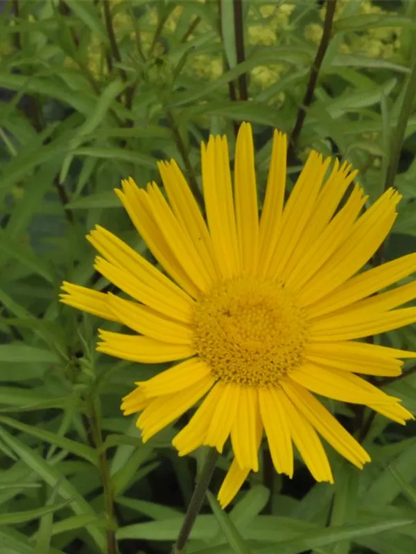 Buphthalmum salicifolium bildet körbchenartige, goldgelbe Blüten ab Juli.