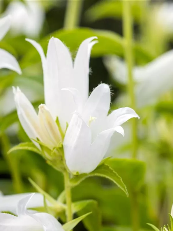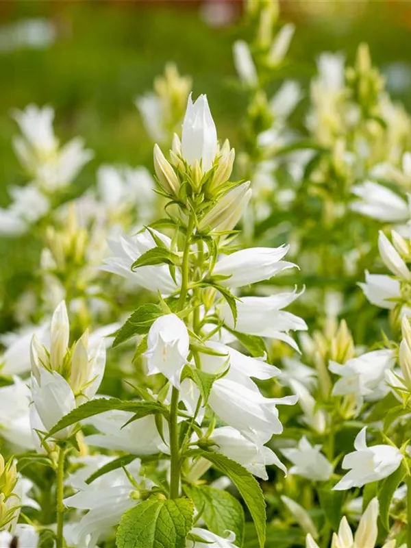 Campanula latifolia var. macrantha 'Alba' bildet glockenförmige, in Trauben angeordnete, weiße Blüten ab Juni.