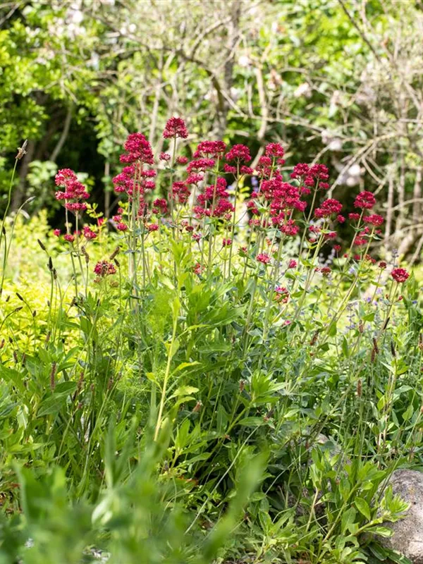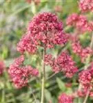 Centranthus ruber 'Coccineus' bildet sternförmige, in Rispen angeordnete, scharlachrote Blüten ab Juni.