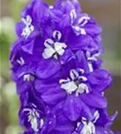Delphinium pacific 'Blue Bird' bildet gefüllte, in Rispen angeordnete, blau-weiße Blüten ab Juni. Bei richtiger Pflege Nachblüte von September bis Oktober.