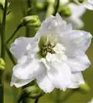 Delphinium pacific 'Galahad' bildet gefüllte, in Rispen angeordnete, weiße Blüten ab Juni. Bei richtiger Pflege Nachblüte von September bis Oktober.