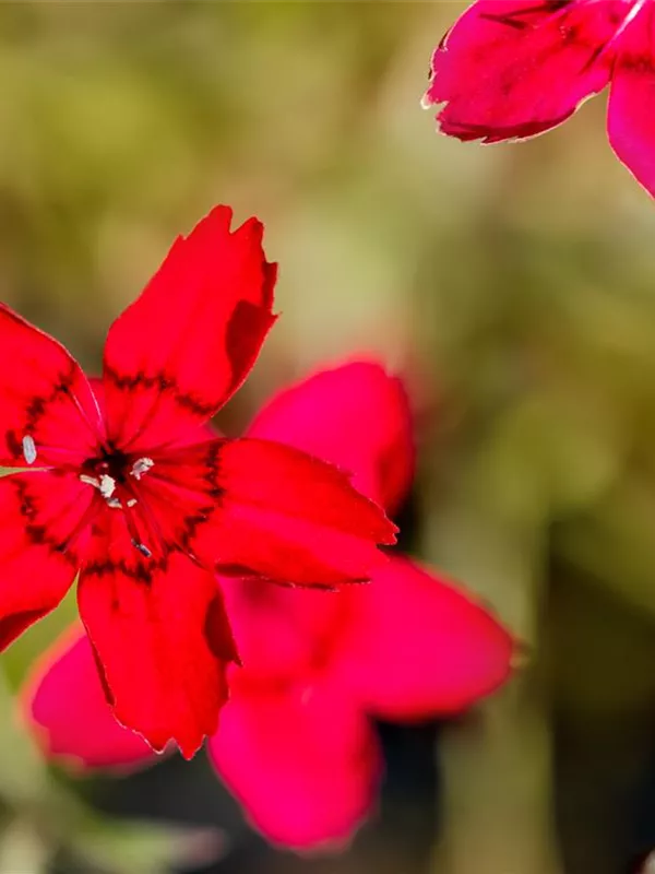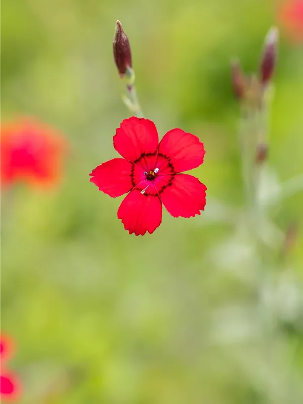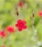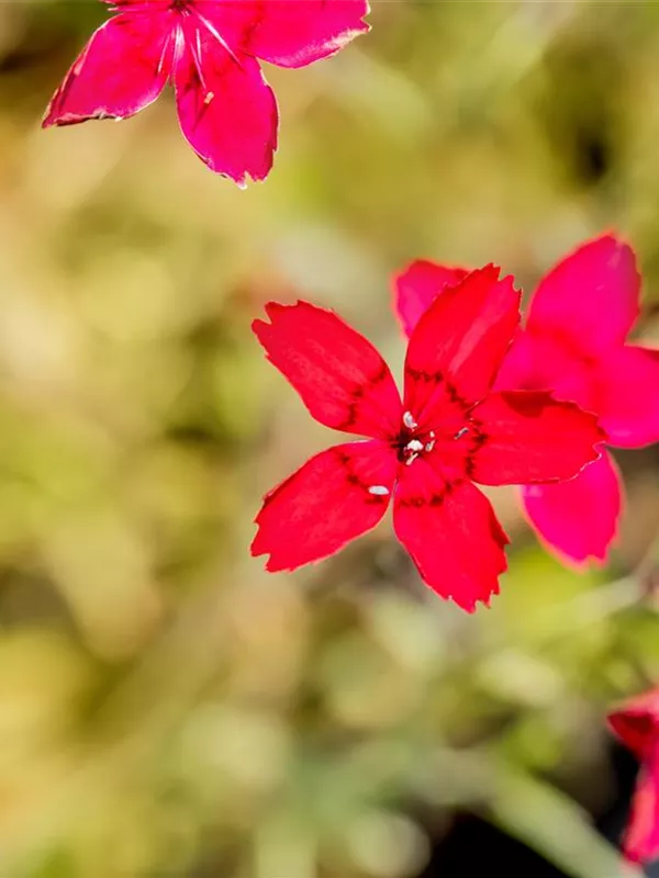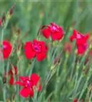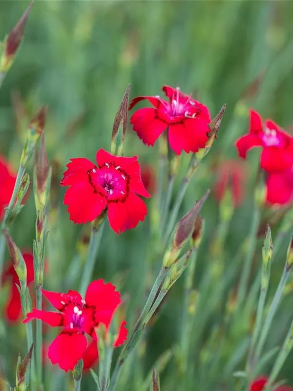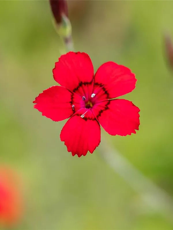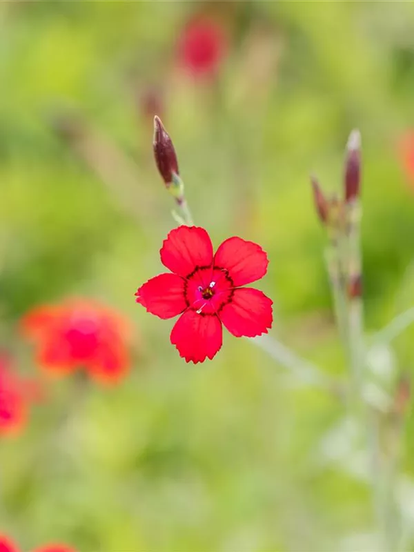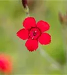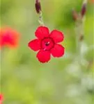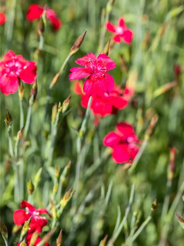 Dianthus deltoides 'Leuchtfunk' bildet radförmige, scharlachrote Blüten ab Juni. Diese verströmen einen angenehmen Duft.