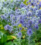 Eryngium planum 'Blue Hobbit' bildet blaue Blüten ab Juli.