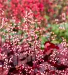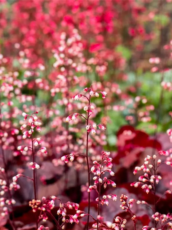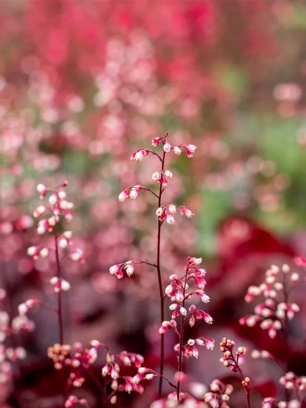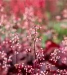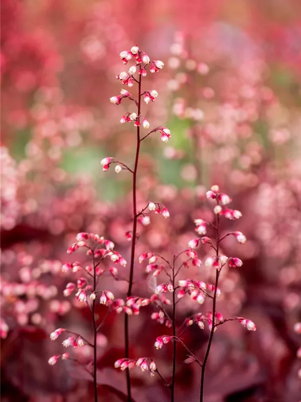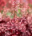 Heuchera micrantha 'Fire Chief' bildet glockenförmige, in Trauben angeordnete, hellrosafarbene Blüten ab Juni.