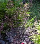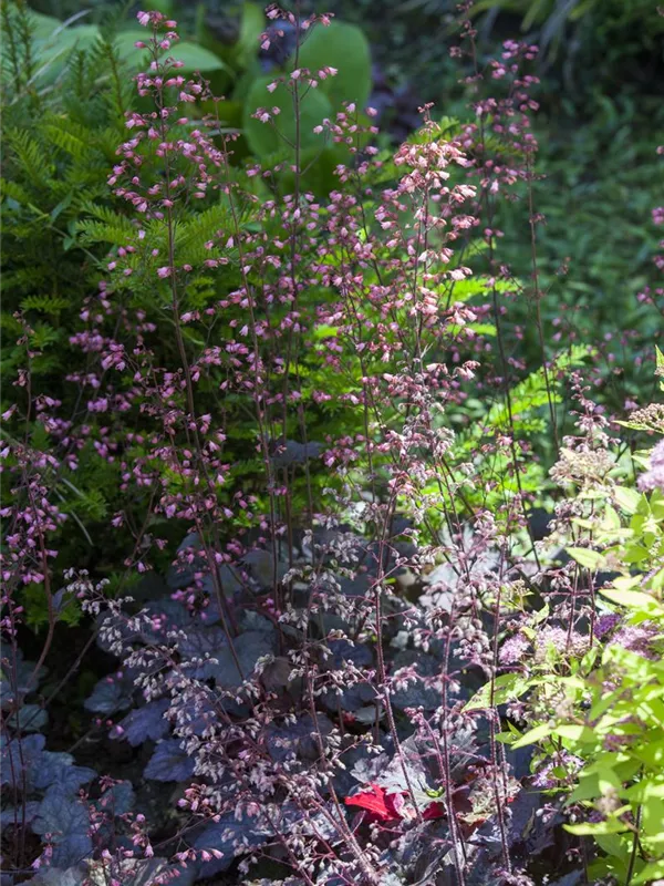 Heuchera micrantha 'Regina' bildet glockenförmige, in Trauben angeordnete, hellrosafarbene Blüten ab Juni.