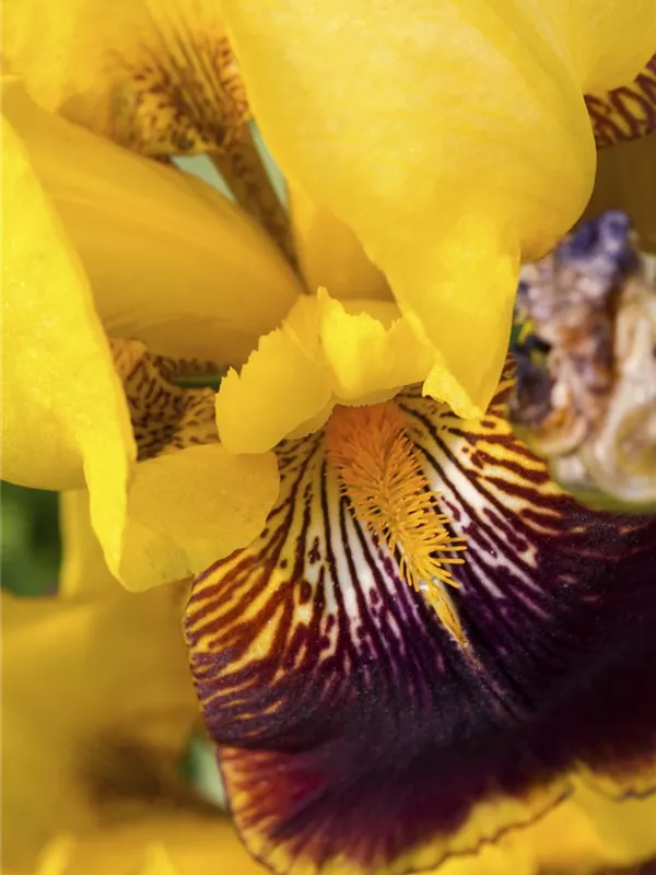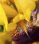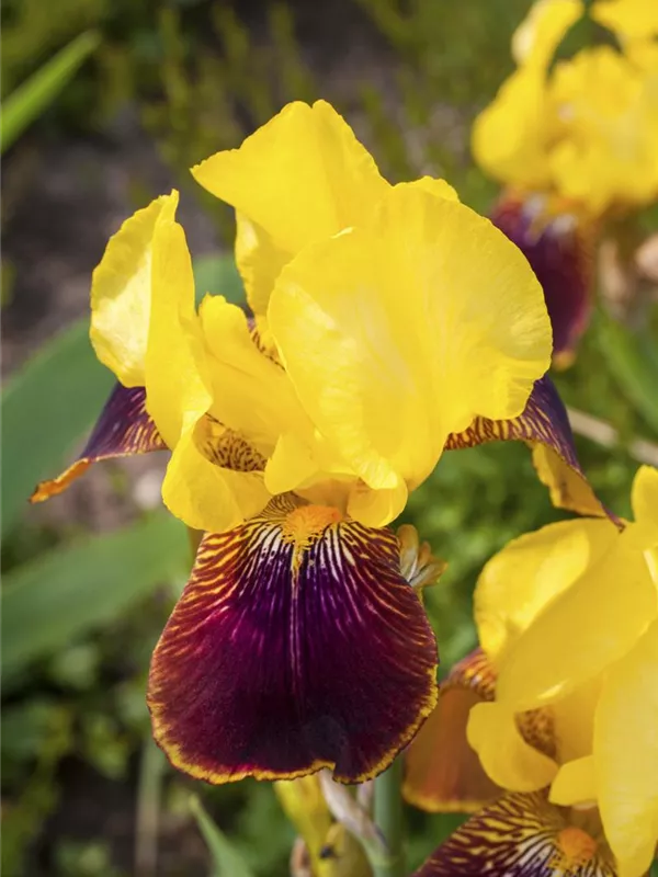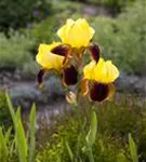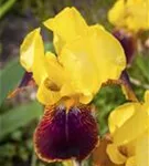 Iris x germanica 'Ola Kala' bildet lippenförmige, goldgelbe Blüten ab Mai.