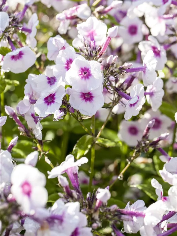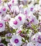 Phlox paniculata 'Bright Eyes' bildet in Dolden angeordnete, zweifarbige Blüten ab Juli. Diese verströmen einen leichten Duft.