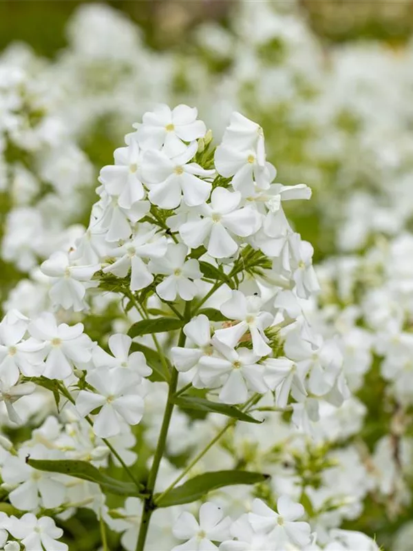 Phlox paniculata 'Pax' bildet in Dolden angeordnete, weiße Blüten ab Juli. Diese verströmen einen leichten Duft.