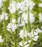 Physostegia virginiana 'Summer Snow' bildet lippenförmige, in Ähren angeordnete, weiße Blüten ab Juli.