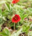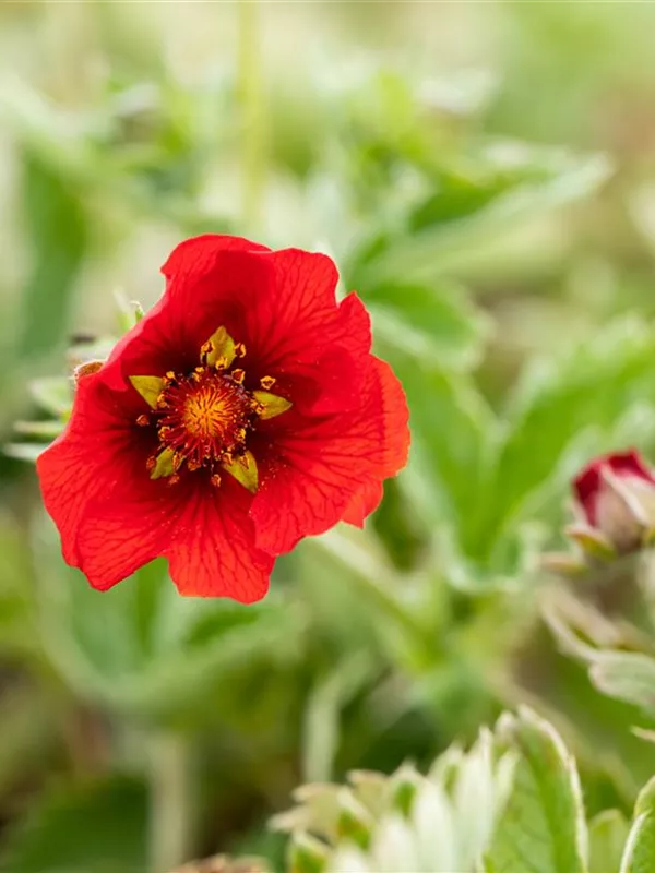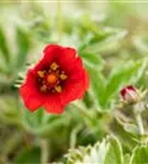 Potentilla atrosanguinea bildet schalenförmige, scharlachrote Blüten ab Juni.