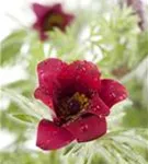 Die sommergrünen Blätter der Rotblühende Garten-Kuhschelle 'Rote Glocke' sind grau-grün, tief geschlitzt.