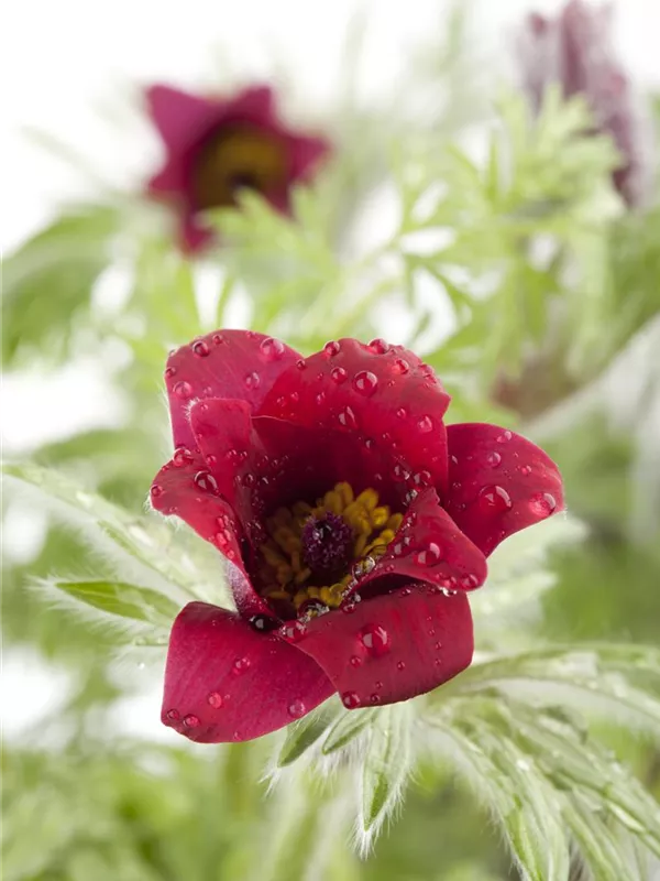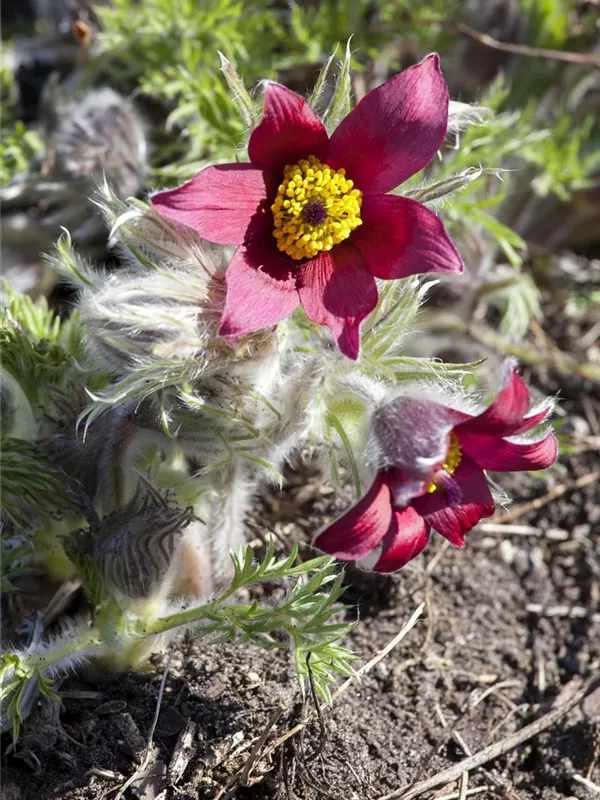 Pulsatilla vulgaris 'Rote Glocke' bildet glockenförmige, dunkelrote Blüten ab März.