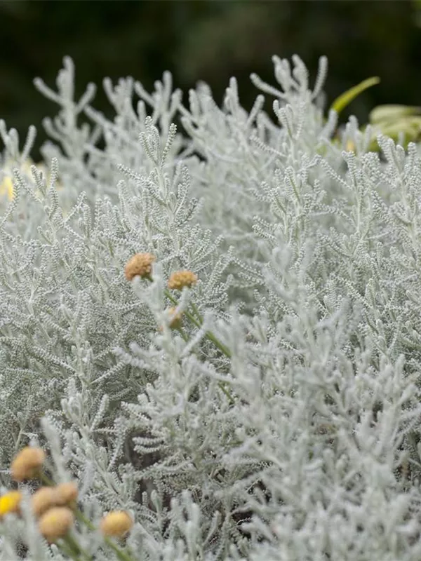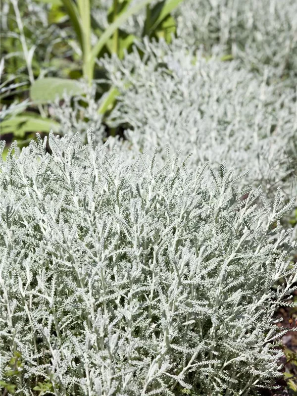 Graues Heiligenkraut ist auch unter diesem Namen bekannt: Silbrigblättriges Heiligenkraut, Silbriges Heiligenkraut oder Duftkraut.